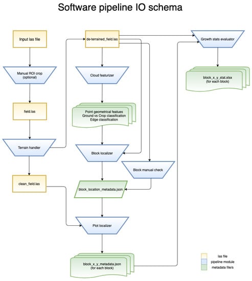 Plant growth and development analysis is a key prerequisite for the successful breeding of new varieties and crop research. However, measuring the growth of above-ground plant organs using a “ruler” represents a laborious and rather subjective process as the person performing the measurements cannot measure all the plants in an experimental field plot. This can introduce important bias into the results of the experiment. To overcome these problems methods for the remote sensing of 3D surface modelling are rapidly being developed. In the plant research community “light detection and ranging” LiDAR sensors are being used more and more for what is termed plant phenotyping []—a rapidly developing field of plant research technologies aiming at high-throughput and automatic analysis of various parameters of plant growth and physiology. This includes the application of various sensors, but LiDAR has now become the most popular one for the precise estimation of plant height and biomass in field conditions. A boom of methods employing LiDAR can now be observed in agricultural research []. LiDAR sensors can be mounted on a tractor-carrier, independent carrying-wheel platform or unmanned air vehicles (UAV) that can be easily applicable in various crops and field-plot designs. A combination of UAV and a LiDAR sensor gives the user the opportunity to make measurements at various locations, independently of field design, the crop species, or their developmental stage. Measuring the plant canopy height using LiDAR was successfully tested in various monocots, showing significant correlations with manually measured parameters. In [], was reported in Arundo donax, which is similar to previous results in wheat [] or maize []. The accuracy of the measurement is dependent on the object (crop species) being scanned and the scanning and flight parameters. However, the accuracy of the algorithm and the mathematical model used for the estimation of the agronomical characteristics extracted from the point cloud are equally important []. The key objectives in point cloud processing for agricultural purposes are: 1. to distinguish points belonging to the crop of interest from those belonging to the ground and also from points that do not represent either of them (typically weeds); 2. to find a model for removing outlier points that arose incidentally during the LiDAR scanning; 3. in the case of a field plot experiment, to detect individual field plots automatically and analyse them as independent experimental units; 4. select a proper model for the expression of spatial information (thousands of points per square metre) in reliable and informative parameters (how the plant height is calculated). After the raw data from the laser scanner is processed, which is usually performed in commercial software, the point cloud file is generated. The next step is to prepare a digital terrain model (DTM), which can also be performed in commercial or open-source software. However, there is a lack of specialized tools for the non-GIS community that can be applied for specific purposes such as crop field plots. As UAV LiDAR sensors become more available and their prices decrease, the need for specific software tools will increase. Specifically, for the estimation of crop height it seems to be useful to design algorithms capable of automatically generating DTM, extracting automatically from DTM points belonging to crops or crop plots and then providing an estimation of crop characteristics such as plant height or biomass. Up to now, most researchers have used non-specific tools for the classification of points within point clouds into the “ground” and “non-ground” classes [,,]. However, for experimental fields that may possibly consist of thousands of field plots some type of automatic processing will be necessary. Here we offer to the community a new software tool in Python programming language that can automatically or semi-automatically process raw point clouds to extract growth parameters, namely canopy height. The goal was to develop end-to-end software purely written in Python without the need of additional software to support our solution. After some research it was obvious that it is a quite challenging goal. There are some public codes of methods for point cloud processing mainly developed in Matlab or C++, but nothing what could provide us with required output. Lack of publicly available tools for point cloud analysis led us to try to develop such a software. This software tool is open-source and is freely available here: https://github.com/UPOL-Plant-phenotyping-research-group/UAV-crop-analyzer, accessed on 1 June 2021.