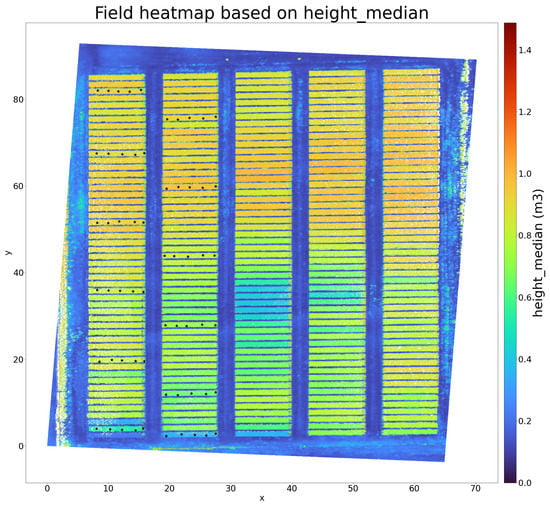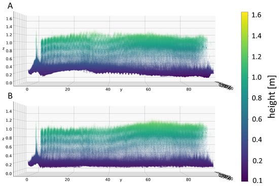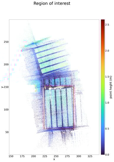 A las file is an industry-standard binary format for storing airborne LiDAR data. It is an open, binary format specified by the American Society for Photogrammetry and Remote Sensing (ASPRS). The format is widely used and regarded as an industry standard for LiDAR data. For las files manipulation our software uses the Laspy Python library (https://pythonhosted.org/laspy/index.html, accessed on 1 June 2021). The version of las files analysed in this paper is 1.2 (http://www.asprs.org/a/society/committees/standards/asprs_las_format_v12.pdf, accessed on 1 June 2021). A las file generated with a 40 m flight has 9,367,385 points and with a 20 m flight it has 37,506,852 points. The las file of the field that was analysed has 2,730,256 points and a point density of 443 points/m for a 40 m flight. The field for the 20 m flight has 11,456,520 points and a point density of 1895 points/m.