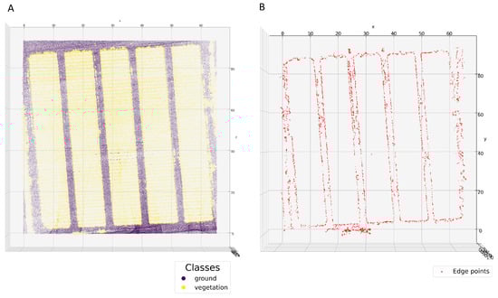 The following module of the pipeline, a cloud_evaluator.py performs the point featurization, the ground-crop point classification and the edge points detection. For each point of , the neighbourhood of the k-nearest neighbours and the neighbourhood of given radius is determined with the KDTree algorithm. For each neighbourhood, PCA [] is applied, to compute eigenvalues and eigenvectors. On the basis of computed eigenvalues and eigenvectors, several features are computed (sum of eigenvalues, omnivariance, eigenentropy, anisotropy, planarity, linearity, surface variation, sphericity, verticality, first order moment and average distance in neighbourhood) []. It is convenient to use downsampling to reduce the time of processing. It is possible to localize the experimental blocks with even significantly reduced amount of point. After the points featurization, two sets of features are generated. set for the radius neighbourhood and for the k-nearest neighbours neighbourhood. For both sets of features, the Expectation–Maximization clustering using GMM algorithm [,] with two components is evaluated. Based on average height of clusters, crop class and the ground class is easily determined for the both clusterings. A point is considered to be crop class only if it was clustered as this class for both feature sets.