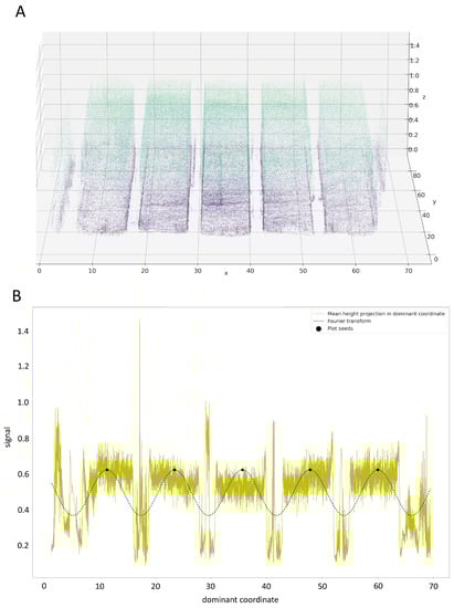 (A) Vegetation points after rotation (experimental blocks are visible in the side view); (B) Fourier transformation of “vegetation point signal” in the dominant coordinate.