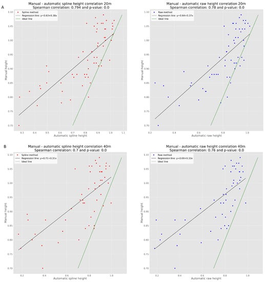For 40 m scanning, both methods underestimate the real growth. For the raw method the median of difference (manual-automatic) is cm and for the spline method it is cm. The median relative/percentage difference is 15.3% for the raw method and 15.6% for the spline method. On the evidence of the boxplot chart, both methods have similar difference distributions. The Spearman correlation coefficient (see Figure 10) was computed to demonstrate the mutual relationship between manual and automatic height measurement (the Pearson correlation coefficient cannot be used because of the violation of the data normality assumption). The raw method correlates with the manual measurements slightly better than the spline method and .
