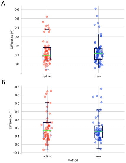 For 20 m scanning, both methods also underestimate the real growth. For the raw method the median difference (manual-automatic) is cm and for the spline method it is cm. The median relative/percentage difference is for the raw method and for the spline method. On the evidence of the boxplot chart (see Figure 11), both methods also have a similar difference distribution for the 20 m scanning. The Spearman correlation coefficient was computed to demonstrate the mutual relationship between manual and automatic height measurement (the Pearson correlation coefficient cannot be used because of the violation of the data normality assumption). The spline method correlates with the manual measurements slightly better than the raw method. However, the difference is even smaller than for 40-m scanning.