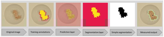 Ilastik [50,58] is an open-source pixel classification tool used to produce simple semantic segmentations of images (Figure 2). This tool performs classification using a random forest classifier with 100 trees, which was chosen for its good ‘generalisation’ performance, robust choice making when using small sample sizes, and reproducibility of results [59,60,61]. Pixel features and their scales are chosen to discriminate between the different classes of pixels. Ilastik gives the option to choose features that use color/intensity, edge (brightness or color gradient) and texture to discern objects. Each feature can be selected on different scales, corresponding to the sigma of the Gaussian and evaluate classifier predictions from the user’s annotations. Filters with higher sigma values can pull information from larger neighbourhoods. Initially, all features were selected to give the model the highest power, as recommended [58]. Through project testing, the ‘suggested features’ tool within Ilastik was used to determine the optimal settings for sensitivity to select the features that are the most effective at discriminating between pixels in different classes. Through testing project sensitivity (‘all features’ sensitivity = 0.95, ‘suggested features’ sensitivity = 0.93) and the average percentage difference of area (‘all features’ area difference = 7.3%, ‘suggested features’ area difference = 8.6%) we chose to use all features. This is recommended by the Ilastik developers [50] and demonstrates high accuracy [51]. Sensitivity is defined as: