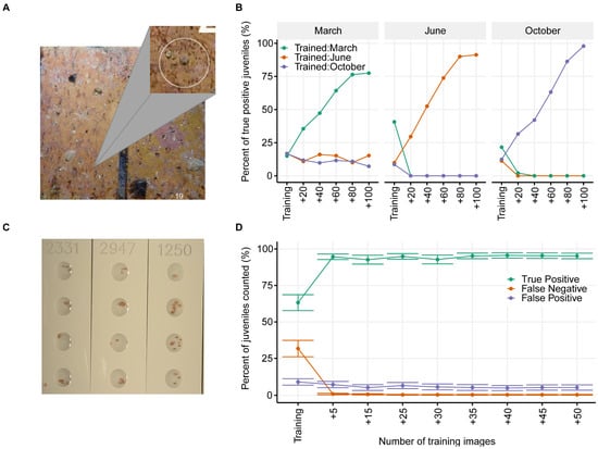 The optimal number of tile images to train with to measure survival was consistent for all timepoints, but varied by which month’s images were used in training (Figure 3A). The optimal number of training images to train on was 100 for all months (March, June, and October), giving a True Positive Rate (TPRs) value of 77.5%, 91.3% and 97.9%, respectively, when trained using training images from the same time point (Figure 3B). The number of juveniles counted as alive was consistently low (<25%) if trained using images from a different time point.
