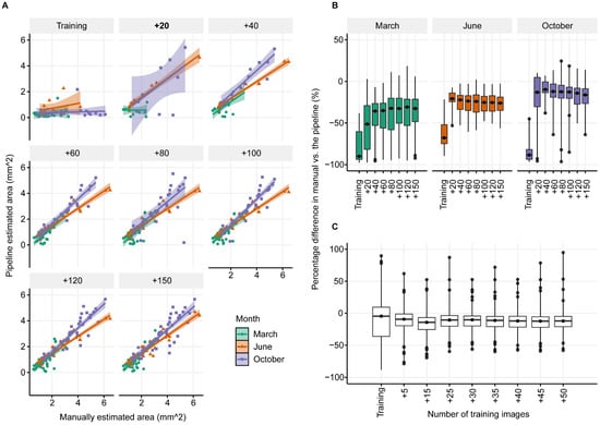 The correlation between ground truth manual measurements of coral juvenile area and the measurement of the segmentation masks made by the pipeline on the tile images varied by month and the number of images used in training (Figure 4A). For the March data, the regression with the best fit was found when training with 150 images (R2 = 0.634, p = 1.76 × 1014), although training with 60 images showed a similar fit (R2 = 0.614, p = 6.84 × 108). The best fit regression for the June data was found when training with 40 images (R2 = 0.936, p = 8.51 × 1015), whilst the October data was best fit when trained with 60 images (R2 = 0.867, p = 5.76 × 1010; Figure 4A). The regressions indicate a more accurate measurement by the pipeline in the later timepoints (i.e., June and October), indicating higher measurement accuracy in older corals. The area was consistently underpredicted (~30%) by the pipeline when trained with 20 or more images (Figure 4B). After 40 training images, the difference between manual and pipeline measurements did not vary considerably with the mean difference in area measured around 27.9% ± 23.7 for 40 images and 29.1% ± 19.6 for 150 images (Supplementary Table S1). Pairwise comparisons for June and October showed that there was a statistical difference when using the initial training set and all additional numbers of training images (Supplementary Table S2; all p < 0.05). There was no statistical difference between any other number of training images. For March, the pairwise comparison showed that all analyses with more than 40 training images were not significantly different (Supplementary Table S2).