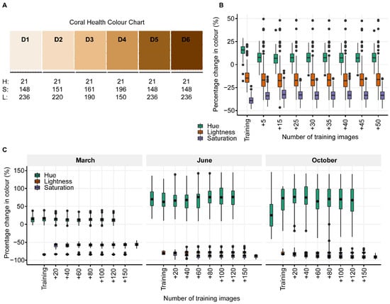 Coral color is used as a health proxy for corals to indicate the relative abundance of symbiont cells (Symbiodiniaceae) inside their tissues [18], where “D1” scores represent low symbiont densities (pale, bleached corals), and “D6” scores represent tissues with high symbiont densities (Figure 5A). Pairwise comparison for the slide images showed significant differences in over and under-predicting HSL values when comparing the initial training set with all other numbers of training images (Figure 5B; Supplementary Tables S3–S5; all p < 0.05). However, there were no significant differences in over- or under-predicting HSL values when five or more training images were used, indicating that the accuracy of color assessment does not significantly improve with greater than five training images.