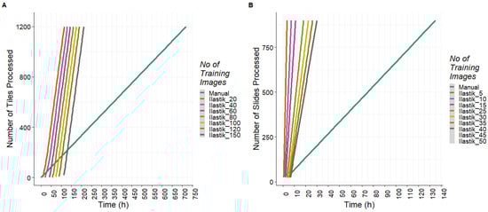 Time comparison between manual versus pipeline measurements. The time taken (hours) to process tiles (A) and slides (B) when training with different numbers of images (represented by different colors) and when using manual measurements versus the pipeline. Manual measurements are indicated by the light blue line on both graphs.