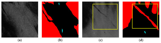 (a,c) are samples of SAR images with large oil-spill-like areas and small oil area inclusion, (b,d) are labels. The long stripe area (in the yellow square) may cause some problems in the model due to the relatively asymmetric mark.