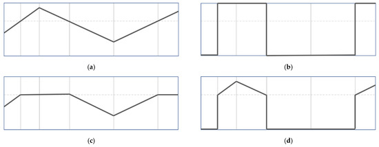 (a) Assumed pixel value distribution, (b) distribution after binary threshold, (c) distribution after the truncated threshold, and (d) distribution after ToZero threshold.
