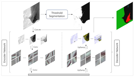 | Input: Oil Spill Dataset Function: Threshold Segmentation (TS) If src(x,y) > the value of threshold then src(x,y) = 0 or maxValue Depending on the algorithm of TS Return feature image Function: Merge Merge feature image and original image Return: fusion data Encoder Network: Repeat: Convolutional: Rectified Linear Unit (ReLU) activation: Max Pooling: Select the largest value in the kernel and record the position Return: feature maps Decoder Network: Repeat: Transposed Convolution: Combine the down-sampling features to reproduce the segmented image Return: k segmentation maps Softmax: Decision making: Each pixel position selects the category with the greatest probability Output: Segmentation image |