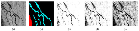 The following pseudo-code (see Algorithm 1) was completed according to the design process shown in Figure 6. In this study, five threshold segmentation algorithms and a basic semantic segmentation network model, UNet, are combined to form five feature merge semantic segmentation network models. They are compiled through the Keras framework [33], including training and testing. For 1002 SAR images in the training dataset, they were divided into 50 batches, where each batch has 450 iterations, and the total number of iterations is more than 20,000. As a parameter setting of the network that needs to be explained, the feature merging does not affect the parameter quantity of the semantic segmentation model; however, the basic network model is the factor determining the number of parameters. The overall parameter quantity of the UNet model is 3.6 million.