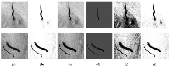 Among these five different methods, Triangle and Otsu are adaptive threshold segmentation methods, both of which use their own algorithms to automatically select the appropriate threshold, whereas Binary, Truncate, and ToZero are manual threshold adjustment methods, and thus the size of the threshold needs to be determined first. In the experiment, 40, 75, and 125 thresholds were used to determine the optimal threshold. In terms of the effect, the three thresholds can obtain the texture of the oil spill area or area similar two an oil spill; however, when the threshold is set to 40, as shown in Figure 7c, the algorithm filters out more features with noise, and only retains the most central part of the dark area, which loses some of the features in the edge between the dark and bright regions. When the threshold is set to 125, as shown in Figure 7e, too much noise is retained, which cannot meet the design requirements of this experiment. When the threshold value is 75, as shown in Figure 7d, it not only keeps the trunk of the oil spill and oil-spill-like areas, but it also filters out most of the noise.