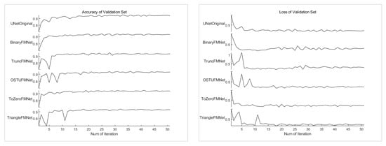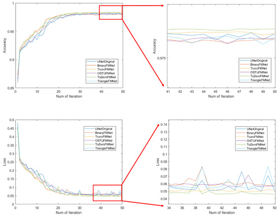 Using 90% of the images in the training dataset to train the model, the remaining 10% of the dataset was used as the validation set of the training model to verify the robustness of the model. The data are then input into the compiled model for the training process, and each iteration process will verify the prediction accuracy of the model. The loss value and accuracy rate of the training and verification processes are shown in Figure 9. The figure shows the performance of the UNet prototype and five FMNet network structures on the training set. From the perspective of the changing state of accuracy, the overall trend is the same. From the very beginning, the accuracy rate was approximately 0.86, and the accuracy rate quickly reached approximately 91% during the early stage of training, and the fluctuation then rose to approximately 98% in the later stage. The figure on the right shows the change in accuracy of the last 10 models. From Table 1, it can be seen that the final training accuracy of the UNetOriginal model is 98.16%, the loss value is 0.051, the verification accuracy rate is 93.2%, and the loss value is 0.235, which are considered baselines. The accuracy of the three models BinaryFMNet, OSTUFMNet, and TriangleFMNet are 98.02%, 98.06%, and 98.08%, respectively, which are almost the same as those of the original model; however, these models have negative characteristics in comparison to the original model, i.e., the volatility changes in the later period are severe. The ToZeroFMNet model not only achieves the best stability, but also the highest accuracy, reaching 98.40%. In addition, TruncFMNet also achieves a good stability, but its accuracy rate of 98.26% ranks second. The change trend of the loss value of each model is almost the same as that of the accuracy, although the numerical value is the opposite. From Figure 8, it can also be seen that the loss value has the best stability in the later ToZeroFMNet model, and the lowest loss value is 0.047. Several other models are volatile at this stage. Larger volatility indicates that the model experiences a serious overfitting.