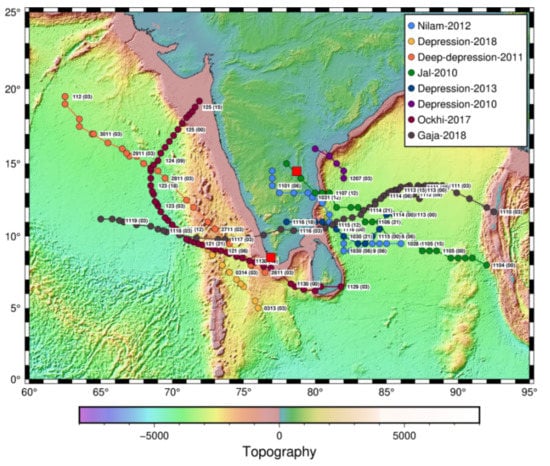 Tracks of selected NIO TCs. The disdrometers’ sites are denoted with red square boxes. Along the tracks, the date and time of each TC is denoted in the form of MonthDay (hours).