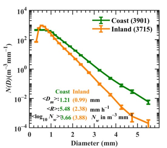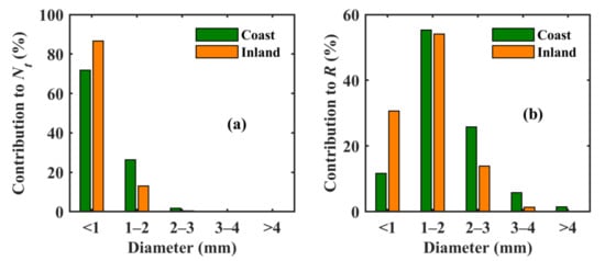 To appraise the NIO TCs RSDs variability between the coastal and inland stations, the contribution of drop diameter classes (as shown in x-axis labels of Figure 4) to total number concentration (Nt, m−3) and rainfall rate (R, m h−1) are portrayed in Figure 4. For both the locations (coast and inland), with the increase in drop diameter classes, contribution to total number concentration decreased, while that to rainfall rate increased and then decreased, and this characteristic is alike with the findings of Chen et al. [10] for the Pacific Ocean TCs measured in Japan. Small-size drops predominantly added to a higher Nt (> 80% and > 70% for the NIO TCs measured at the inland and coastal stations, respectively) and contributed to about 30% of the rainfall rate at the inland station, and 11% of rainfall rate at the coastal station. The contribution of raindrops with diameters 1−2 mm to number concentration is around 13% (26%), and their contribution to rainfall rate is around 54% (55%) for the NIO TCs measured at the inland (coastal) station. The contribution of drops with diameters 2−3 mm to number concentration is negligible (<2% and <0.5% for the NIO TCs measured at the coastal and inland stations), and the contribution to rainfall rate is around 13% for the inland station and 25% for the coastal station. Figure 4a,b clearly demonstrates that raindrops with diameter < 3 mm contributed to a higher percentage of total number concentration and rainfall rate for the NIO TCs measured at both stations.