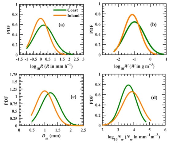 The PDF of (a) log10R, (b) log10W, (c) Dm (mm), and (d) log10Nw for the NIO TCs measured at the coastal and inland stations.
