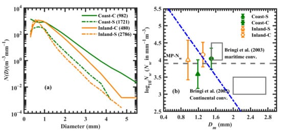 (a) Variations in mean raindrop concentration for stratiform (S) and convective (C) rainfall, and (b) variations of mean log10Nw with Dm values for convective and stratiform rainfall measured at the coastal and inland stations.