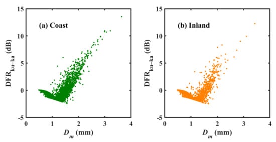 The GPM DPR that operates at Ka- and Ku-band can provide the radar reflectivities at these two frequencies and are denoted, respectively, as ZKa and ZKu. The RSDs (Dm and Nw) and the rainfall parameters for the GPM DPR can be inferred from the difference between the radar reflectivity at two frequency bands, known as the differential frequency ratio (DFR, in dB) [50]. The ZKu and ZKa are evaluated from the RSD measurements from the coastal and inland station using T-matrix simulations with 20 °C temperature [51,52]. The scatter plots of DFR with Dm values at the coast and inland are depicted in Figure 6. Parallel to the results reported in the literature, DFR-Dm plots for both the locations showed a “double solution” problem, which leads to the ambiguity in the estimation of Dm [1,50]. This double solution problem arises due to the dominance of Rayleigh scattering at Ka-band and Ku-band reflectivities during the weak rain, which is mostly associated with small-size raindrops [53]. Due to the dual-value problem with DFR, rather than deriving the empirical relations between Dm and DRF, like previous researchers [2,54,55], we evaluated the relations between Dm and effective radar reflectivity values. The distributions of Dm−ZKu, Dm−ZKa, and log10Nw−Dm and their polynomial fit lines for the coastal and inland stations are illustrated in Figure 7. For both the locations, ZKu/ZKa increases with the increase in Dm values. The second-degree polynomial relations (Dm−ZKa, Dm−ZKu, log10Nw−Dm relations) computed using the non-linear least squares method for the inland and coastal stations are also depicted in Figure 7. The derived Dm relations with Zku, Zka, and Nw clearly demonstrate that they differ substantially from the coast to the inland station, which hints at the need to adopt different empirical relations while estimating the DSD parameters for the NIO TCs from the GPM DPR measurements.