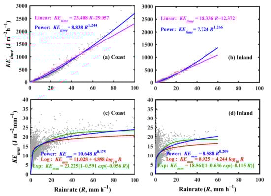 Scatter plots of rainfall kinetic energy (KEtime and KEmm) with rainfall rate (R, mm h−1) for the NIO TCs measured at the coastal and inland stations.