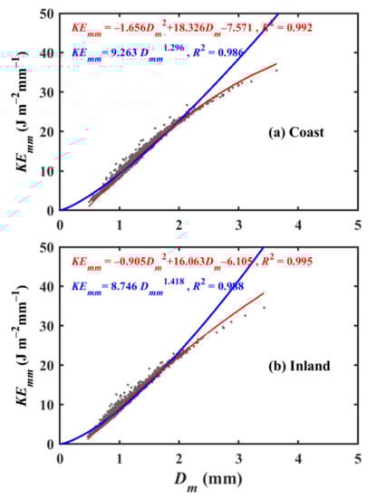 Rainfall kinetic energy (KE) is an important parameter in soil erosion studies that is used in estimating the rainfall erosivity factor [56]. Because of the expensive experimental requirement for the direct measurement of rainfall KE, alternative methods have been adopted by previous researchers [57,58]. Alternatively, rainfall KE can be estimated from the RSD information measured with the disdrometers [44]. For the locations where there is no availability of RSD information, the KE and the rainfall erosivity factor can be estimated using the empirical relations between rainfall KE and rainfall intensity (KE-R relations) [3,59]. These relations showed diversity with the geographical location and weather systems [3,21,60,61], which requires one to deduce region-specific relations. Moreover, in India, due to the lack of indigenous KE relations, previous studies adopted the relations of other areas [62], which can result in overestimation or underestimation of KE. Henceforth, in the present work, for the first time, the NIO TCs rainfall KE relations are obtained in terms of R (rainfall intensity, mm h−1), and Dm (mass-weighted mean diameter, mm).
