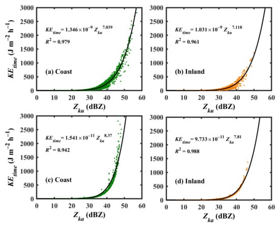 Scatter plots of rainfall kinetic energy with Zku and Zka for the NIO TCs measured at the coastal and inland stations.
