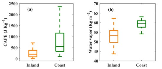 (a) CAPE and (b) vertical integral of water vapor values for the coastal and inland stations.