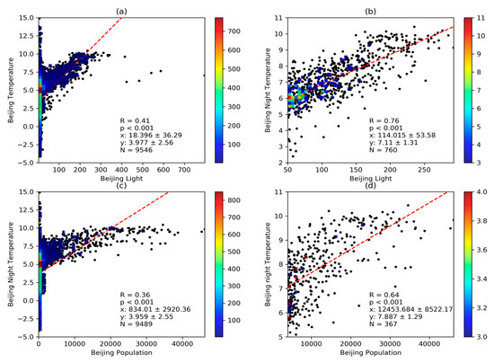 The correlation between the nighttime LST and night light (a), the correlation between the nighttime LST and annual mean population over 5 years based on all data (c), (b,d) are the density distribution for all night light values ranging between 50 and 300 nW/(cm2str) and with a population level larger than 4000 per pixel in Beijing.