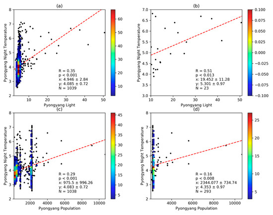 Same as Figure 2 but for Pyongyang. The correlation between the nighttime LST and night light (a), the correlation between the nighttime LST and annual mean population over 5 years based on all data (c), (b,d) are the density distribution for all night light values larger than 10 nW/(cm2str) and with a population level larger than 2000 per pixel.