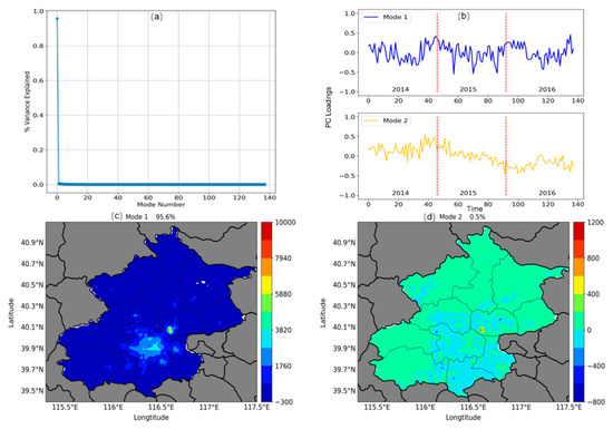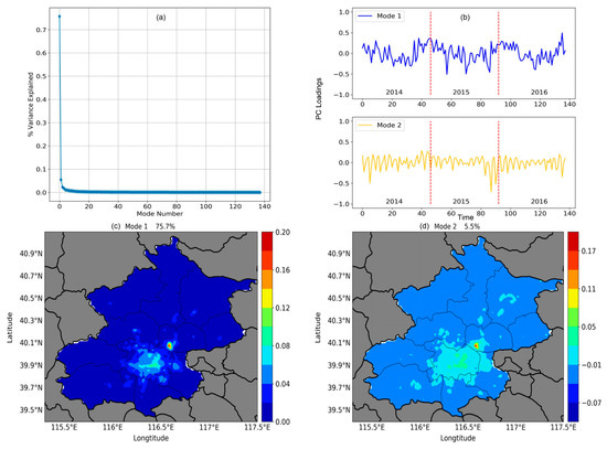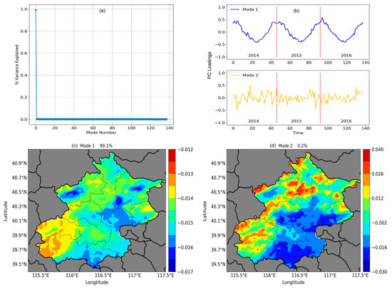 The S-mode PCA results for Beijing surface temperature data during 2014–2016: (a) the variance explained by the principal covariance analysis (PCA) modes for surface temperature; (b) the PC time series of the first two modes (the red vertical lines are used to divide data into different years); (c,d) the spatial patterns of the first two modes for the PCA results.
