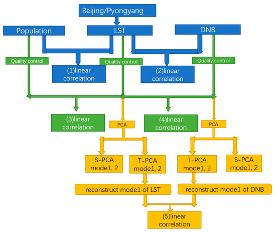 For Pyongyang in Figure 10, the T-mode PCA results for LST data show that there is a seasonal cycle and the hot areas are distributed in urban areas, as shown in PCS1. Simultaneously, there are some peaks in PCL2, which mostly happen in summer. These peaks may correspond to biomass burning. A seasonal cycle also exists in the PCL1 for T-mode PCA results for DNB data; however, there was no annual trend for DNB data, which means that we could not find an obvious developing signal for Pyongyang. Using PCL1 and PCS1 to reconstruct LST and DNB, the correlation coefficient between LST and DNB increased from 0.35 to 0.38. Similarly, the correlation of reconstructed LST and population data was also analyzed and the coefficient increased from 0.29 to 0.32 (Figure 11). To better illustrate the data processing and analysis, a structure diagram is shown in Figure 12.