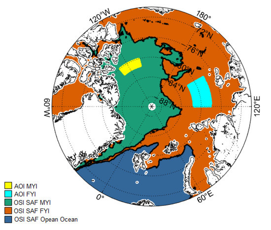 For selecting study areas we use sea ice type charts from Ocean and Sea Ice Satellite Application Facility (OSI SAF). The sea ice type product of the European Organisation for the Exploitation of Meteorological Satellites (EUMETSAT) OSI SAF is available at www.osi-saf.org (accessed on 29 July 2021). The ice classes are assigned from atmospherically corrected Special Sensor Microwave Imager/Sounder (SSMIS) brightness temperatures (19H, 19V, 37V, 91H and 91V, where H and V note horizontal and vertical polarisation, respectively) and Advanced SCATterometer (ASCAT) (C-band) backscatter values on-board EUMETSAT platform Metop-A and Metop-B, by using a Bayesian approach. The sea ice types are provided in a grid with a resolution of 10 km spacing on a Polar Stereographic projection and possess a time span of 24 h. The sea ice types utilise the OSI SAF sea ice edge product to define the border between sea ice and open water, using a threshold of 30% of ice concentration [34,35]. For this study, days with the maximum sea ice extent are chosen to visually recognise specific FYI and MYI areas as training data sets. Furthermore, data from OSI SAF sea ice types from February 2014 to 2018 have been extracted in order to compare with the classified AltiKa data, i.e., data from each day of the month have been combined and averaged to create a monthly ice type chart for February for each of the specified years.