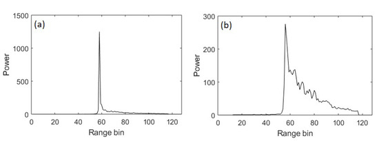 Identifying whether waveforms are specular or diffuse renders it possible to discriminate between measurements of calm ocean surface (leads) and ice surfaces [25]. When a radar burst is reflected from a smooth, mirror-like surface, e.g., leads or very calm ocean, a specular echo occurs. In a case such as this, the power in the range window rises and falls again very rapidly, creating a narrow echo. Diffuse echoes occur when the radar burst is scattered from a rougher surface, e.g., deformed sea ice, where the echoes become less peaky compared to specular returns from the calm water [16]. Examples of waveforms from specular and diffuse echoes are shown in Figure 3.