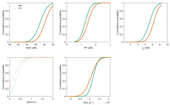 Inspired by these studies, we also investigated the parameters by cumulative probability functions (CDFs) (see Figure 5) and distances between FYI and MYI that were determined by Kolmogorov–Smirnov (KS) two-sided test similar to Zygmuntowska et al. [15] and Shu et al. [28] (see Table 4). These approaches result in the same overall behaviour, i.e., MYI has lower MAX, and PP values when compared to FYI, reflecting that the surface of FYI is smoother than MYI. TES shows significantly more overlap and a smaller difference between the distributions, and LEW’s CDFs are somewhat hard to analyse qualitatively as they do not follow a similar pattern as the rest of the parameters.
