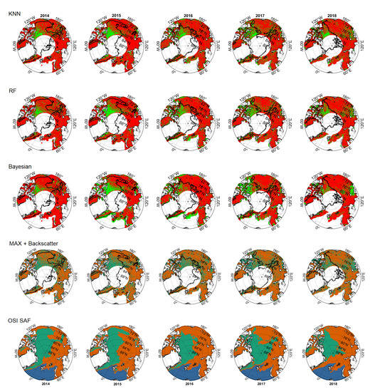 In this section, we aim to classify the pan-Arctic sea ice types (FYI and MYI) by using four classifiers (KNN, RF, Bayesian and threshold-based) and to test their performance following the method described in Section 3.3.5.