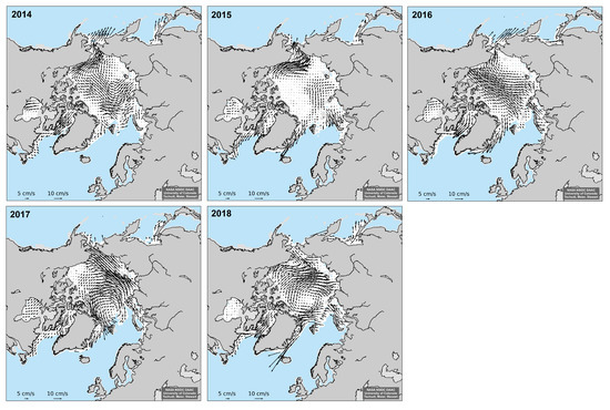 Misclassification of sea ice types can be caused by changes in the typical ice type-dependent surface characteristics, e.g., by deformation [26] and/or melting and refreezing. As we study the sea ice classifications from February, melting and re-freezing should not affect our results significantly. However, deformation caused by the drift of sea ice driven by wind and ocean currents can affect our results to a certain extent. In order to properly understand the surface roughness and its dependency on the ice type classification (Figure 7), we have inspected sea ice drift maps in the month prior to the classification (January) downloaded from the NASA Distributed Active Archive Center (DAAC) at the National Snow and Ice Data Centre (NSIDC), as shown in Figure 8. When we investigated the sea ice drift maps from January 2016 and compared it to the other years (2014–2015; 2017–2018), a change in the drift pattern in the Arctic Ocean was observed, which allowed us to assume that the FYI in that year has become more deformed than the other years, causing it to appear more similar to MYI resulting in misclassification. This indicates that the characteristics of AltiKa are dependent on the surface type in the sense of flat and deformed ice, similar to findings in Zygmuntowska [26]. Thus, we can likewise conclude that as long as the surface properties (flat or deformed) follows the expected sea ice types (FYI or MYI), a classification of these two sea ice types is possible. The drift and the aforementioned conclusion also explains the missing MYI classification near the Beaufort Sea, simply suggesting that the MYI in this area has a smoother surface. This also explains the overestimation of MYI near the Siberian Sea in both 2017 and 2018—in reality, these areas were covered by heavily deformed FYI.