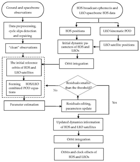 - Finally, the BDS and LEO satellite orbit dynamics and clock products are calculated and the precise orbits can be derived via orbit integration with the orbit dynamics information. The estimated final orbits are compared with the “true” orbits, which are described in Section 2.1. A flowchart of the above procedures is given in Figure 3.