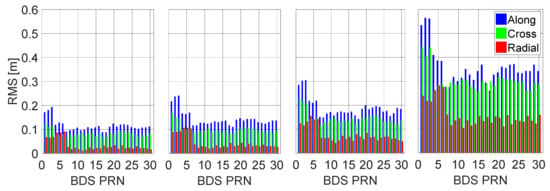 We can see there is an evident difference in the BDS orbit accuracies calculated from different levels of measurement noise: the average GEO, IGSO, and MEO 3D RMS values are 0.24 m, 0.17 m, and 0.14 m, respectively, for the 0.001-m noise level. When the noise level increases to 0.005 m and 0.01 m, the orbit accuracy decreases by 14.3%, 26.1%, and 30.0%, and by 36.8%, 41.4%, and 39.1% on average for the GEO, IGSO, and MEO satellites, respectively. For a noise level of 0.05 m, the orbit accuracy degrades considerably to approximately 0.73 m, 0.54 m, and 0.47 m on average. Therefore, it is necessary to identify and calibrate the actual spaceborne measurement noise.