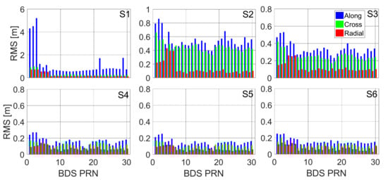 There is another reason for the results shown in Figure 10. As explained before, the BDS POD results are associated with the ODOP value of the LEO constellation. However, they are also closely related to the spaceborne and ground-based observational errors. Note that more careful modeling or precise processing can be done to account for these observational errors. In this study, we do not try to eliminate these errors; instead, we attempt to weaken them by using a large LEO constellation. From Table 5, we can see that the average ODOP value of the three types of BDS satellites derived from the S4 scheme is smaller than that from the S2 scheme; however, the BDS orbit solutions for the two schemes show nearly no difference. This can be explained by investigating the inner accuracy, which is computed as , where the calculation of the coefficient matrix  is identical to that of the ODOP and both are related to the geometric strength, and the variance of the unit weight  is calculated based on the residuals. Larger observational errors will result in larger amplitude residuals and, in turn, larger . Considering the POD accuracy is co-affected by both the ODOP and the observational errors, the BDS orbit solutions in the S4 scheme present identical results to those in the S2 scheme and the lowest ODOP and smallest observational errors after the adjustment of the S6 scheme show the best solutions.