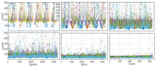 where , , and  represent the coordinates in three directions of the ground station, LEO satellite, and GNSS satellite, respectively.  is the geometry distance vector from the ground station to a GNSS satellite and is similar for . Figure 7 shows the ODOP values of the G05/G10/C02/C03/C06/C11 satellites.