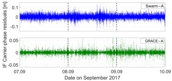 IF carrier-phase measurement residuals for the Swarm-A and GRACE-A spaceborne GPS observations.