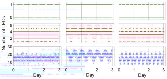 The number of tracked BDS C02 (left three subplots)/C06 (middle three subplots)/C11 (right three subplots) satellites by LEO satellites. The green, red, and blue dots represent the W2/1/0, W12/3/1, and W60/6/4 LEO constellation, respectively.