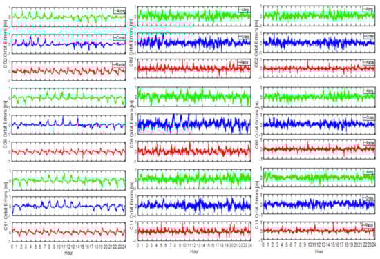 Note that the actual effect of the solar storm on the BDS/LEO combined POD is very difficult to simulate because the impaction time and magnitude are very irregular and almost impossible to accurately simulate. This study makes an approximate simulation and the only certainty is that the initial impaction times for the LEO satellites in different orbital planes or at different altitudes are different. To better understand the influences of the spaceborne observational errors on the BDS POD, a purely geometrical approach was adopted here without considering any of the satellite dynamics. The orbit determination results are shown in Figure 10. Figure 10 displays the POD error time series for the C02, C06, and C11 satellites.