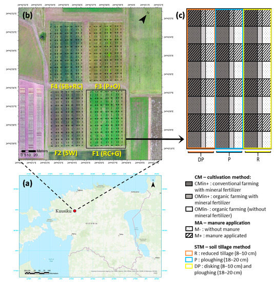 This study commenced at the Agricultural Research Centre (ARC) in Kuusiku (58°58′52.7″N 24°42′59.1″E), Estonia (Figure 1a). The experimental area used in this study covered 226 hectares, of which the 2.87-hectares variety performance trial (VPT) area consists of two soil types: Calcaric Cambisol and Calcaric-Leptic Regosol [37]. The experimental layout consisted of four types of common crop and their regular combinations in Estonia, i.e., Field 1: red clover 75% (Trifolium pratense L.) with grass 25% (Festuca pratensis) (RC + G). Field 2: spring wheat (SW), Field 3: pea and oat mixture (P + O), and Field 4: spring barley with under-sowing red clover (SB + RC) in 2019 (Figure 1b). This experimental design was developed to facilitate the understanding of the physiological conditions and yield performance capabilities of the chosen varieties and their combinations under three types of AMPs. To assess the UAS-based AMP detection capacity, the experiment was put together with three principal experimental factors (Figure 1c), which included: (1) soil tillage methods (STM), considering reduced tillage (R) (8–10 cm), ploughing (P) at a depth traditionally used in conventional tillage (18–20 cm), and disking (DP) (8–10 cm) as treatments; (2) cultivation methods (CM), considering conventional farming with mineral fertilizer application (Cmin+), organic farming with mineral fertilizer application (Omin+), and organic farming without mineral fertilizer (Omin−); and (3) manure applications (MA). Each field comprised 72 plots, which amounted to a total of 288 plots sampled within our study area.