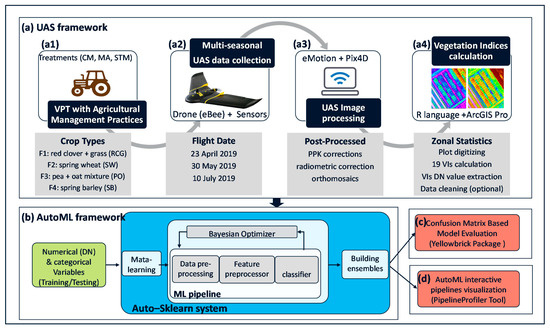 More precisely, the aims of this study were to (1) build an AutoML framework for UAS classification tasks; (2) explore the applicability of UAS sensors to recognize multiple AMP categories, namely soil tillage methods (STM), cultivation methods (CM), and manure application (MA), which have currently not been efficiently examined and are absent of accessible parameters in both UAS and ML fields; and (3) compare AutoML’s ability using different ML classifiers to identify image-based AMPs for diverse crop categories and its appropriate growth stages. To our knowledge, this paper is the first study to use an AutoML system with UAS -derived multispectral VIs, for the agricultural classification task. Moreover, this paper is the first to provide a novel AutoML framework, across multiple AMP activities, and present new insights into UAS and ML optimization methods for future PA and crop phenotyping research.