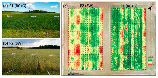 Figure 3 displays the observation of onsite crop VPTs (i.e., Field 1 (F1) (Figure 3a) and Field 2 (F2) (Figure 3b) with CM treatments) and one of the VIs (NDVI; Figure 3c) captured on 10 July from F1 and F2. It can be observed from the onsite AMPs treatment photographs of F1 and F2 in July that it was not readily distinguishable. In addition, it can be seen from the NDVI image that the heterogeneity within the plot may be caused by edge effects or uneven fertilization. For this reason, we used the plot average value considering the pixels inward boundary clipping to decrease the noise.