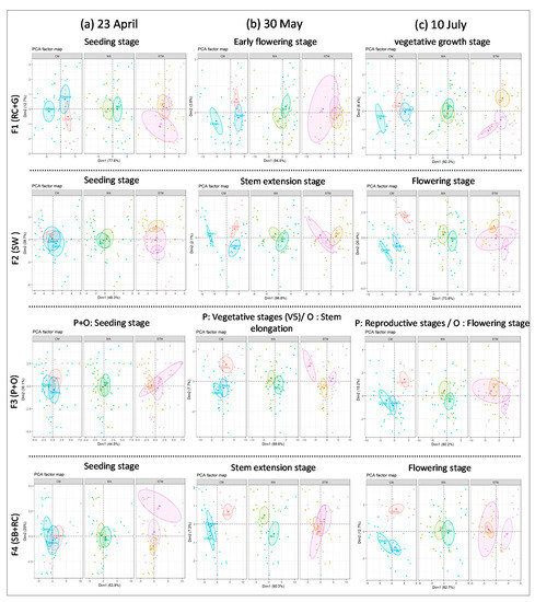 PCA biplot of 19 VI variables (n = 72) of each crop field on (a) 23 April, (b) 30 May, and (c) 10 July. Each biplot shows the PCA individuals (three AMPs) (i.e., CM (Cmin, Omin+, Omin−), MA (M+, M−), STM (DP, P, R)) of the first (x-axis: PC1 score) and second (y-axis: PC2 score) principal components (the variation explained by the dimensions are shown on the axes); four crop categories (F1–F4) and its corresponding growing stage from top to bottom. Colored concentration ellipses (size determined by a 0.95-probability level) show the observations grouped by marked AMP sub-classes.
