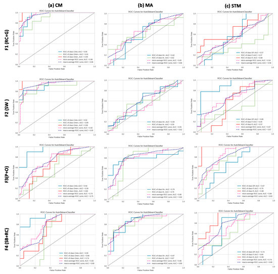 ROC curves and AUC of the AutoML classification corresponding to the subclasses within the AMPs for the acquisition of the UAS-VIs DN in May. From left to right, the ROC curves computed on (a) CM (Cmin+ (blue lines), Omin+ (green lines), Omin− (red lines)); (b) MA [M+ (blue lines), M− (green lines)]; (c) STM (DP (blue lines), P (green lines), R (red lines)); and their micro (pink dotted line) and macro (dark blue dotted line) average performance. Four crop categories (F1–F4) from top to bottom.