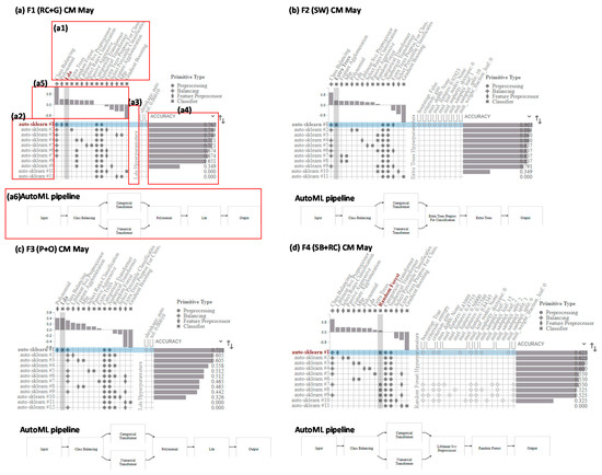 The interactive AutoML pipeline matrix plots with running time-limited setting 60 s sorted by accuracy performance (a–d), (a) Field 1 pipeline matrix with the Top1 classifier LDA, where (a1) illustrated Primitives (in columns) used by the pipelines (a2) (in rows, the blue line showed the best accuracy rank); (a3) one-hot-encoded hyperparameters (in columns) for the primitive across pipelines, (a4) the AutoML pipeline with the accuracy ranking; (a5) Primitive contribution view, showing the correlations between primitive usage and pipeline scores—in a5 displays that class balancing has the highest correlation score with accuracy; (a6) Step by step AutoML Pipeline flowchart. The ML box before Output represents the classifier used by this set of algorithms (in a6 LDA as the classifier) (b–d) Fields 2, 3, and 4 interactive pipeline matrix sort by AutoML accuracy performance with the chosen hyperparameters (top 1 was listed).