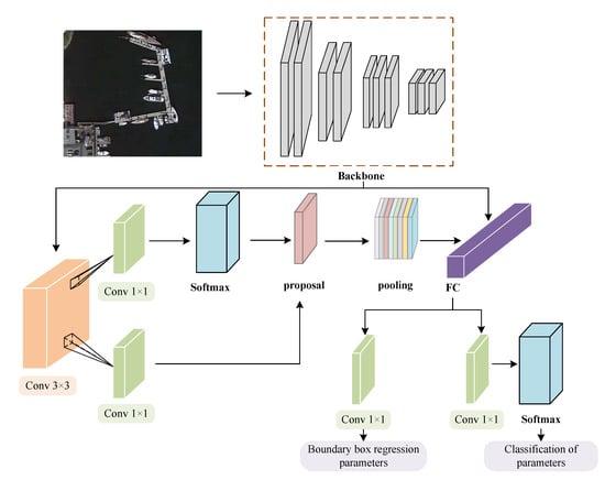 In this section, we introduce our method. The overall framework of our method is shown in Figure 2. In the original Faster R-CNN framework, the network first zooms to a fixed size for an image of any size, and then sends the image to the network; the feature extraction network contains multiple convolutional layers, pooling layers, and activation functions. The RPN network first undergoes 3 × 3 convolution and generates the positive anchor and the corresponding bounding box regression offset, then calculates the candidate area. The ROI pooling layer uses the candidate area to extract the feature of the candidate area from the feature map and send it to the subsequent fully connected softmax network for classification. Then, an attention model that combines space and channel is introduced to detect remote sensing images. In the case of remote sensing images with different coverage areas, ratios, and different directions of objects in the images, effective ship object detection can be achieved. Details of the proposed algorithm are introduced in Figure 2.