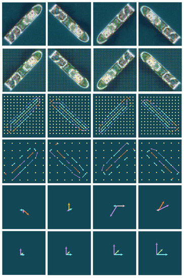 where is the rotated version obtained by rotating F clockwise by degrees, and and represent the n-th direction channel of and M, respectively. In the process of multidirectional convolution, ARF actively acquires the multiangle response of the image until the feature map size of the multidirectional channel is 1, and finally, the position and angle code of the image is obtained. Figure 3 is an example of using the ORN network to train on our data set. Each row represents a layer of the neural network, and each column represents a feature map obtained by an input sample through the network. The rightmost column zooms in on a region in the feature map. It can be seen that the feature map obtained by ARF can obtain the position and angle information of the object. In the second layer, the omnidirectional expansion of the image of the unidirectional channel facilitates the subsequent multiangle convolution. From the ORConv1 layer to the last ORConv4 layer of the network, the values in the feature maps obtained by the numbers under different rotation angles are similar, but the directions are different. The last layer is the ORAlign layer, which uses a method similar to SIFT to align the main directions to achieve rotation invariance.